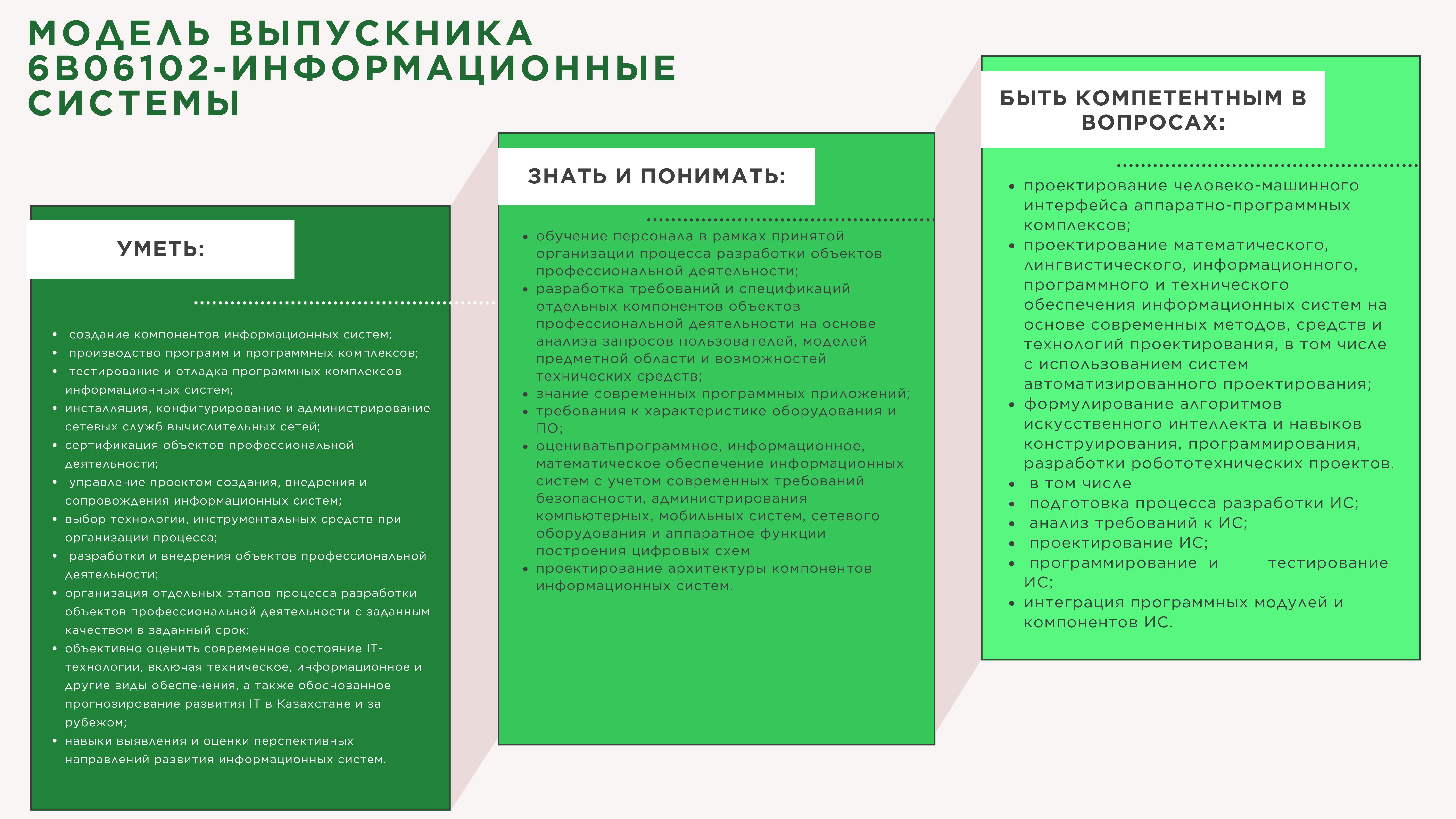 - иметь прочные знания об основных направлениях IT-технологии в РК и в мировом секторе, соблюдении всех формальностей и предусмотренных процедур согласно мировым стандартам;