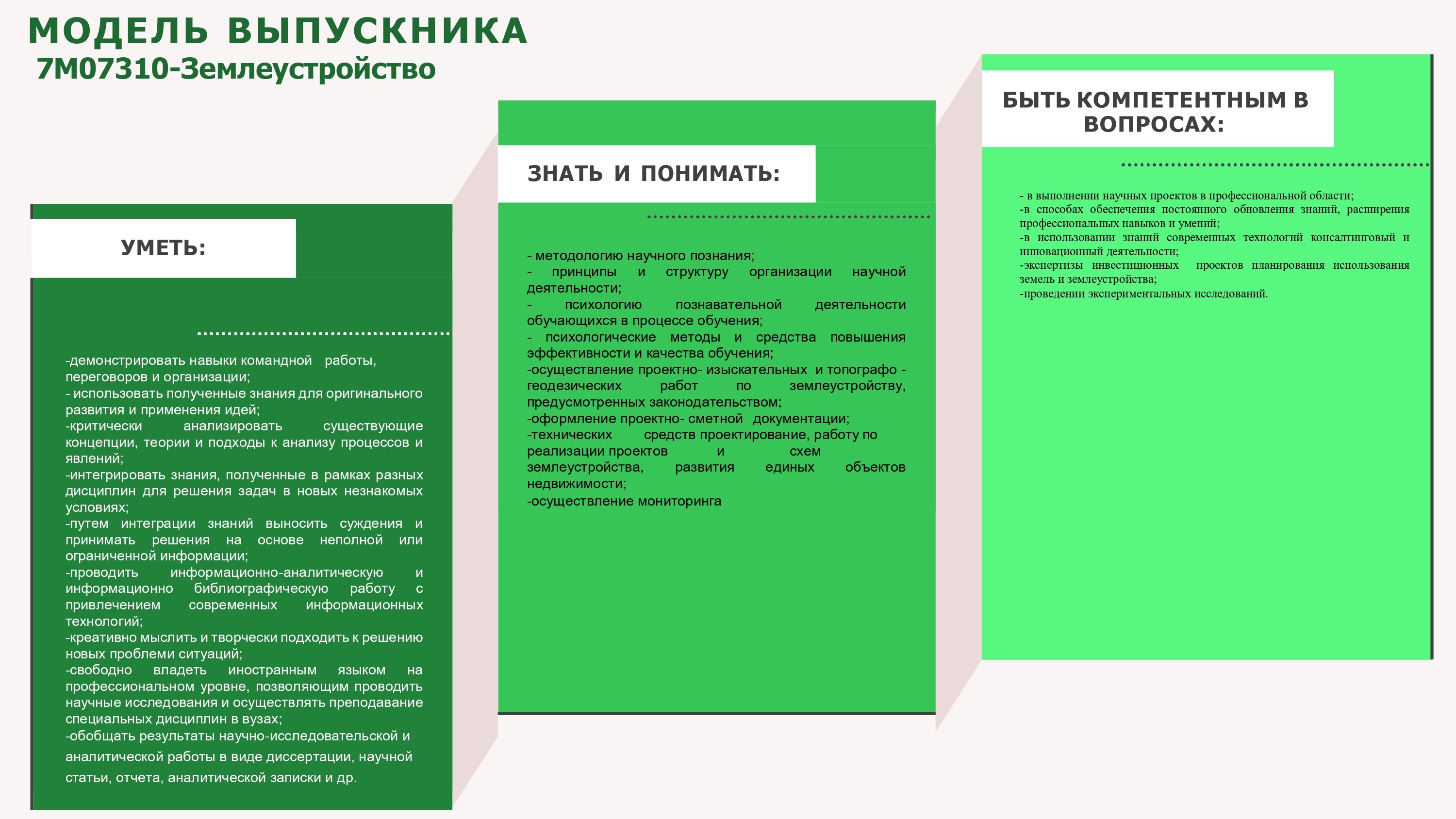 - образовательную (педагогическую), научно-методическую, научно-исследовательские разработки, проектно-изыскательские работы, научно-организационную деятельность в различных областях землеустройства и кадастра