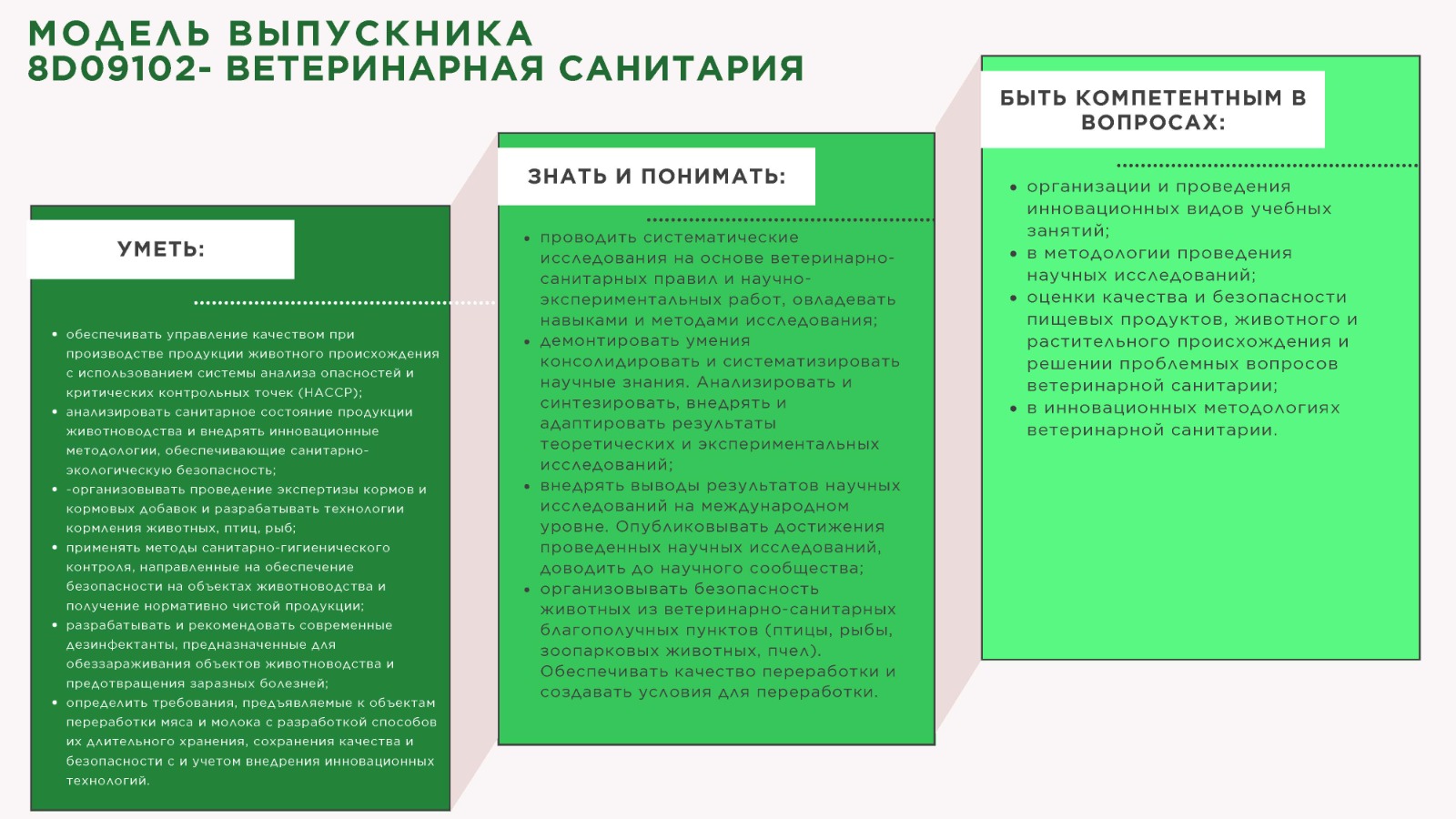 Подготовка компетентных (PhD), с высоким уровнем знания прикладных и фундаментальных наук, владеющими навыками формулирования и решения образовательных, практических задач, способные преподавать и успешно осуществлять исследовательскую, управленческую деятельность по направлению ветеринарной санитарии.