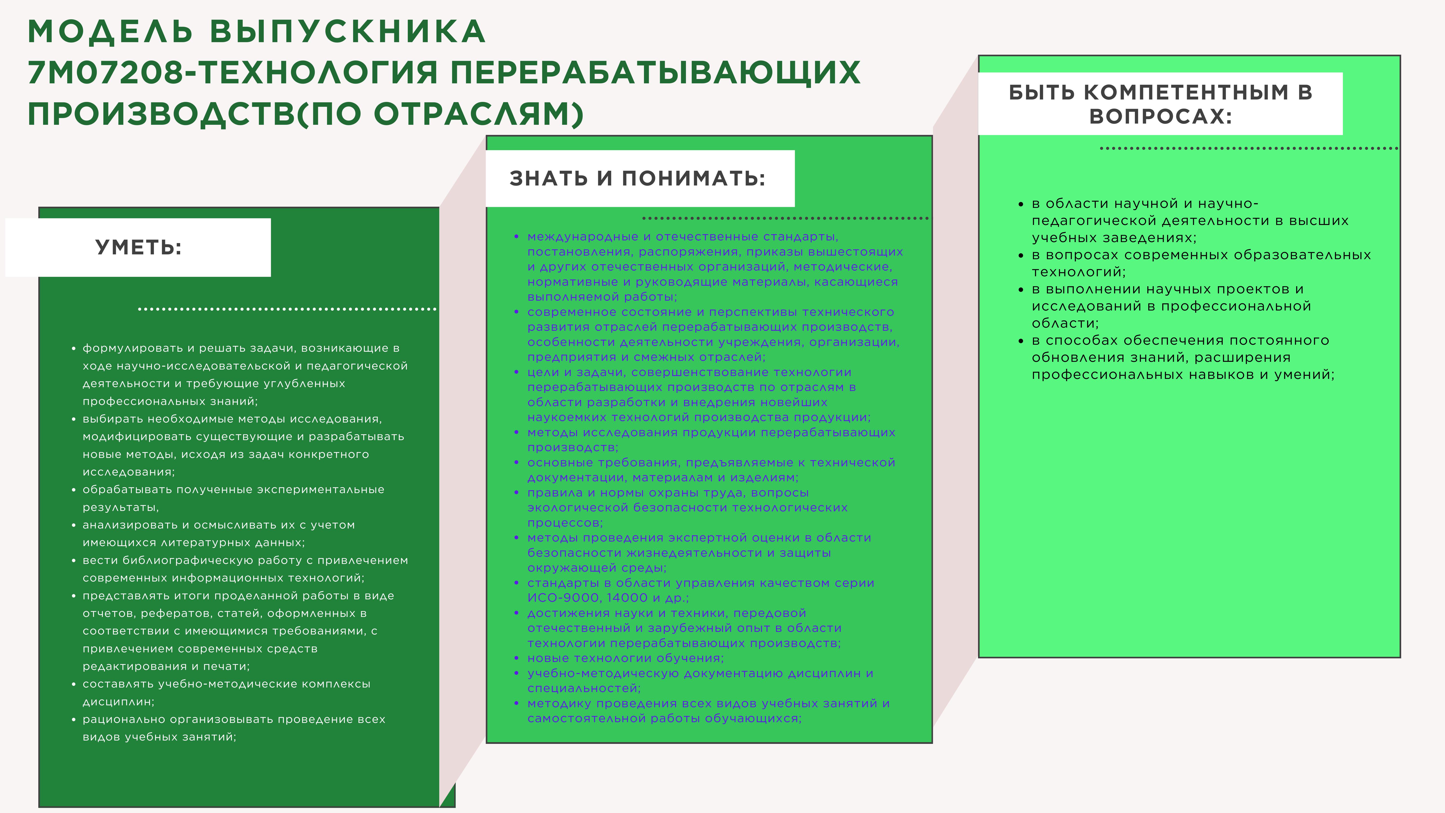 Магистры технических наук по образовательной программе «7M07208 – Технология перерабатывающих производств (по отраслям)» могут выполнять следующие виды профессиональной деятельности:
