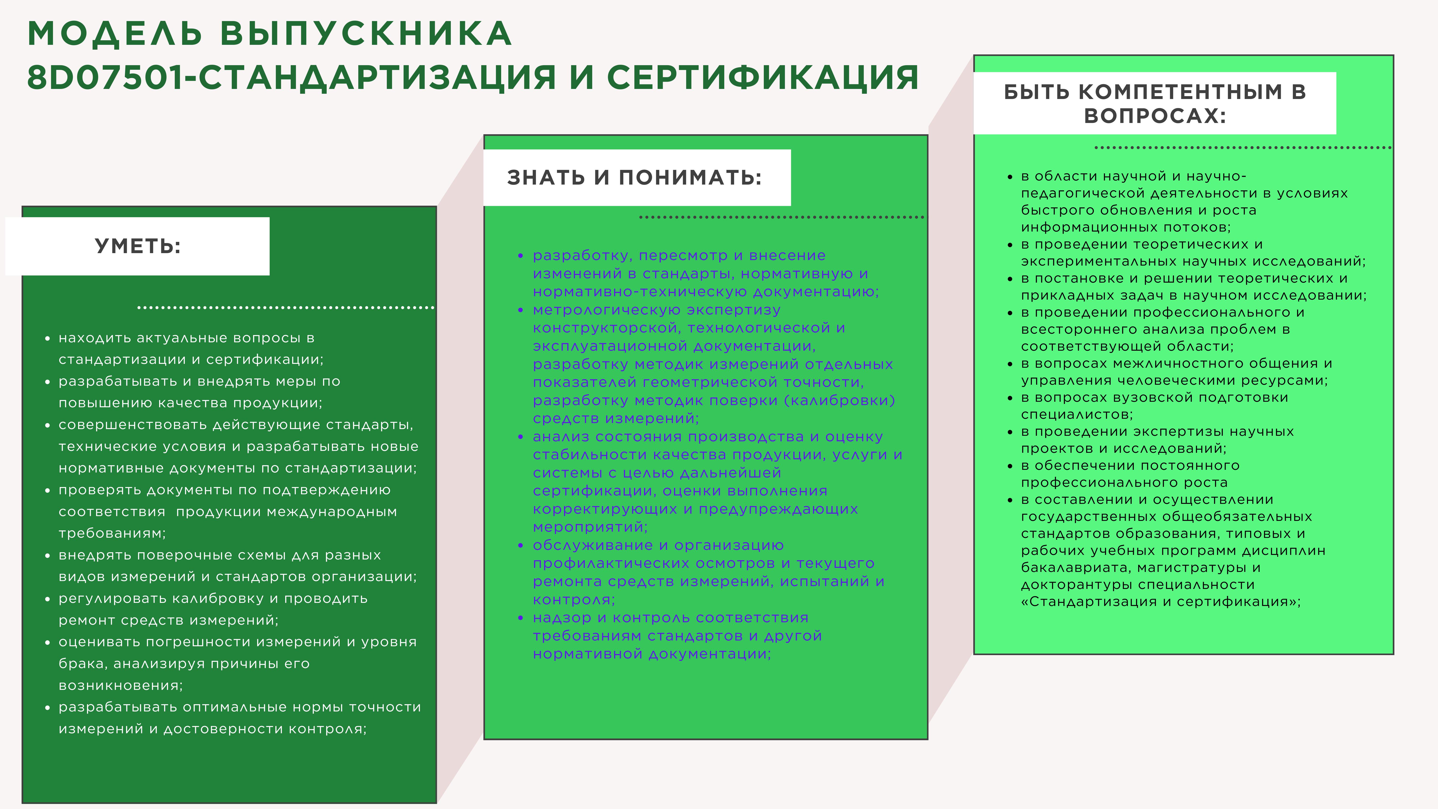 - -в составлении и осуществлении государственных общеобязательных стандартов образования, типовых и рабочих учебных программ дисциплин бакалавриата, магистратуры и докторантуры специальности «Стандартизация и сертификация»;