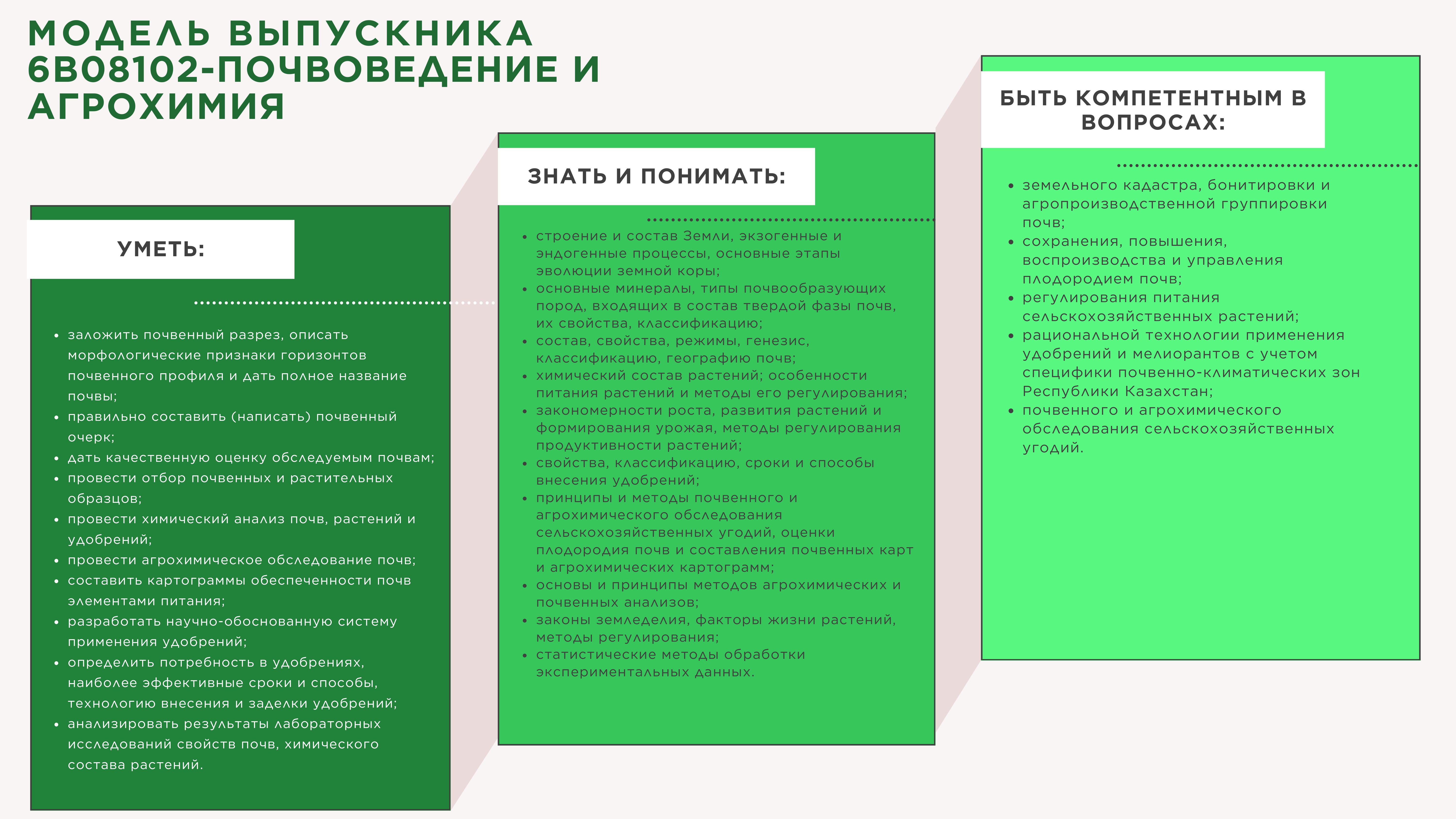 В вопросах почвенной и растительной диагностики, земельного кадастра, бонитировки почв, рациональной технологии применения удобрений с учетом специфики почвенно-климатических зон Республики Казахстан.