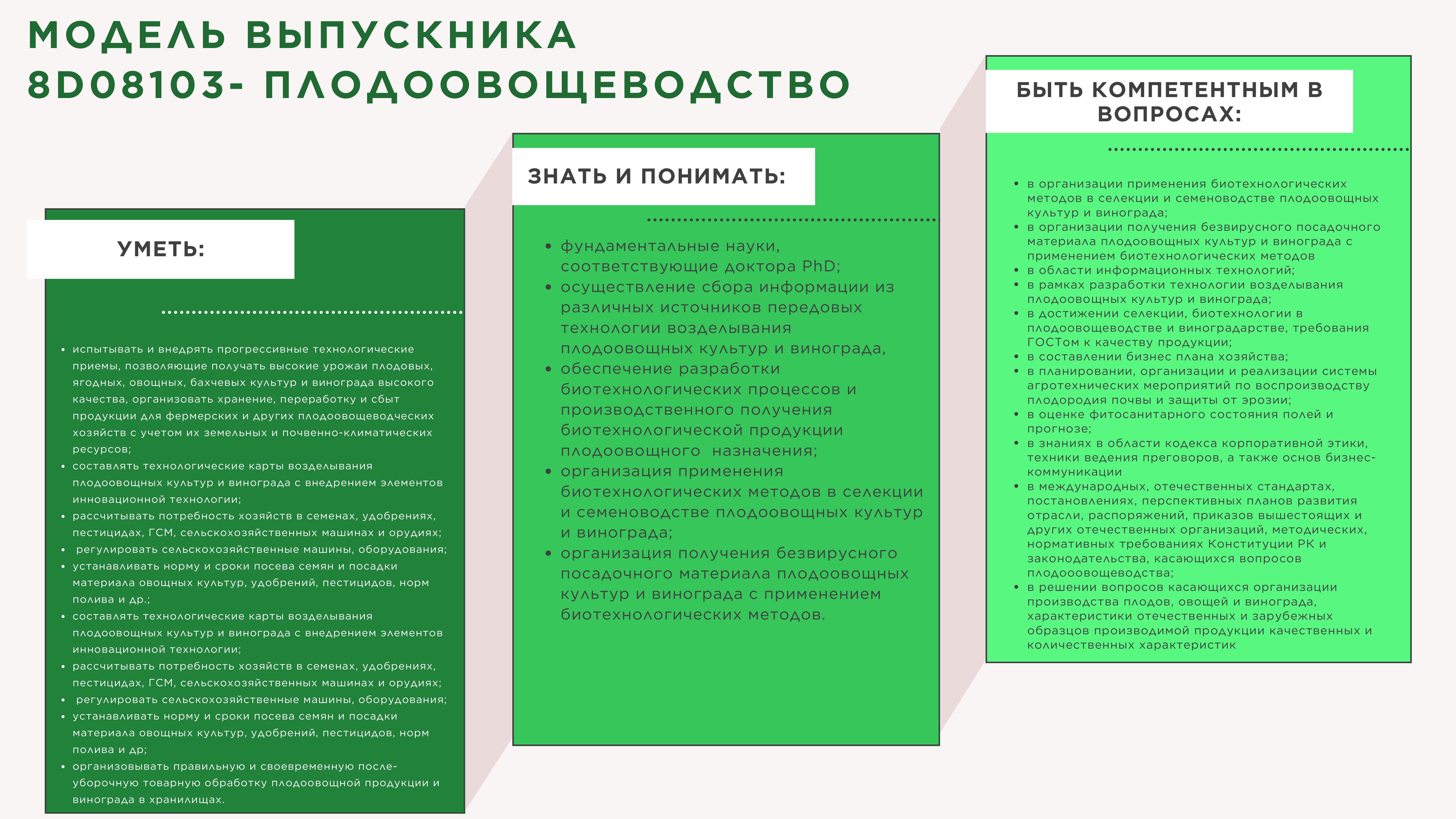 Доктор философии (PhD) по образовательной программы «8D08103 – Плодоовощеводство» может выполнять следующие виды профессиональной деятельности:
