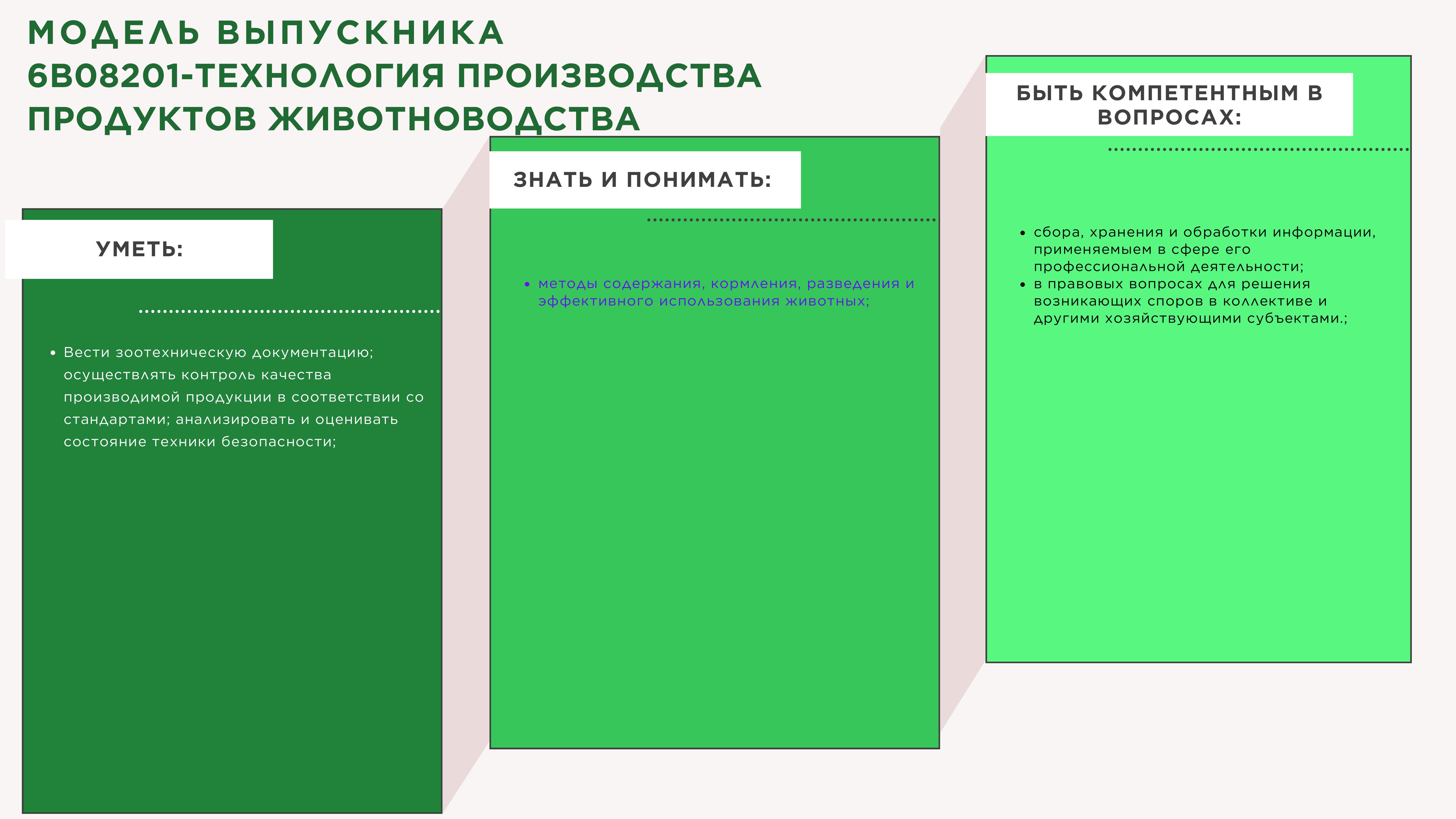 Зоотехния, организационно-управленческая деятельность, научно-исследовательская, образовательная деятельность по технологии производства продуктов животноводства.
